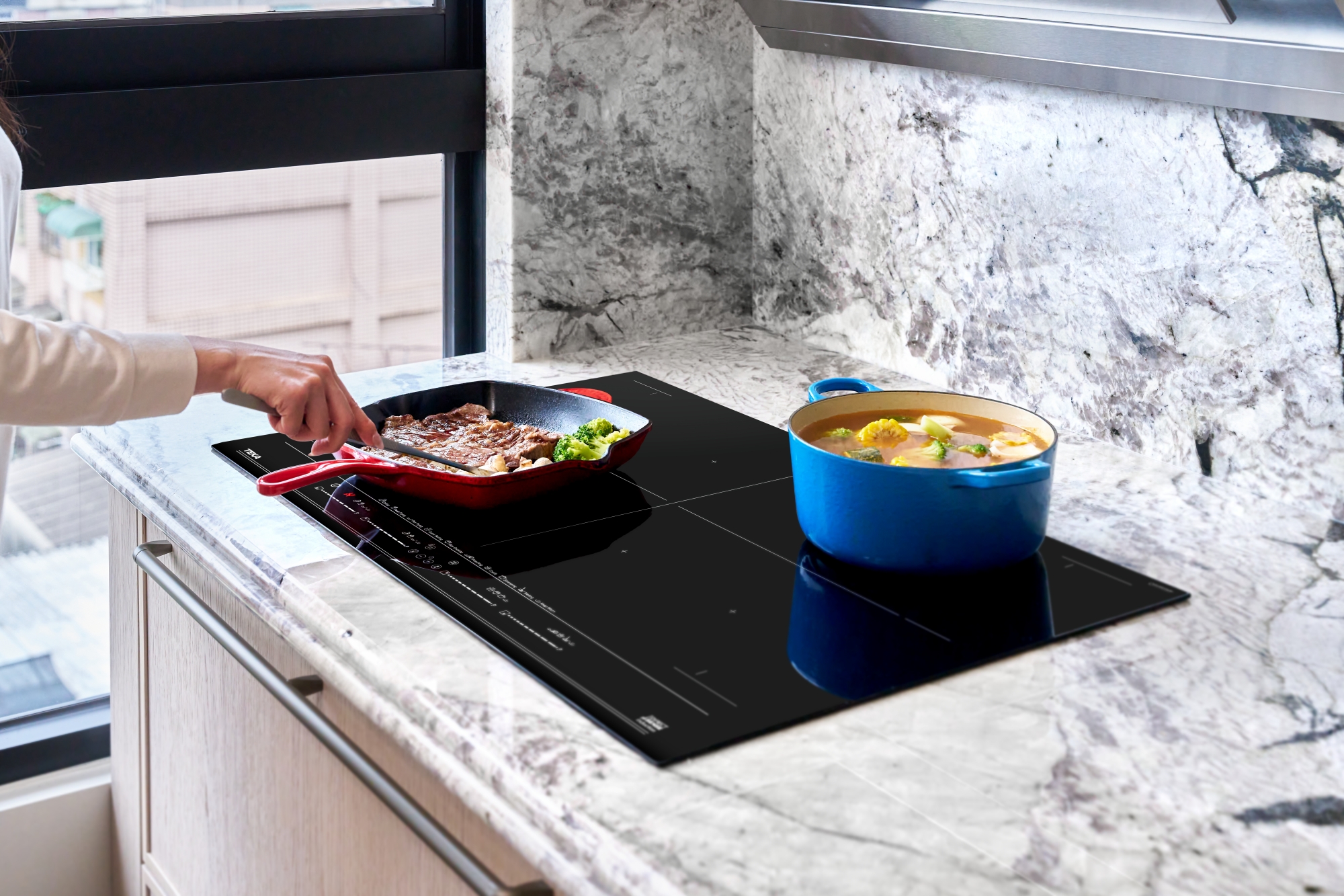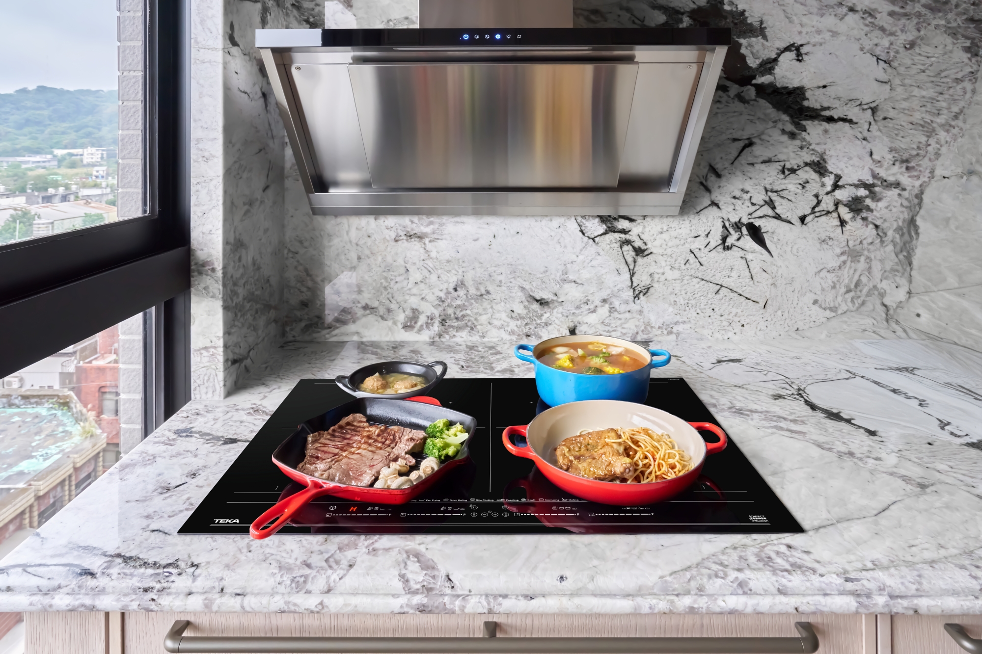 ↑TEKA FullFlex 四口 IH 感應爐具備全區橋接加熱設計,鍋具不受固定區域限制,能同時應對多道料理,提升豪宅廚房的使用彈性。